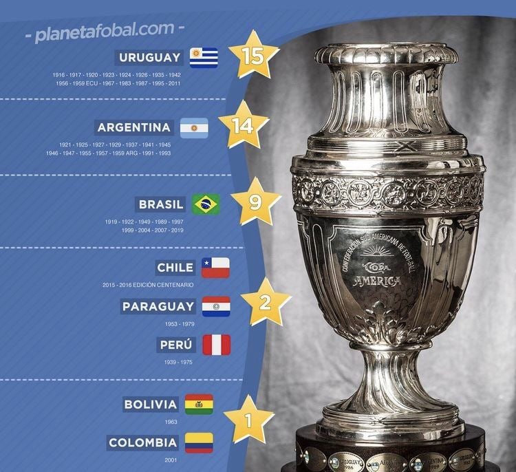 የኮፓ አሜሪካን ዋንጫ በማንሳት ደግሞ አርጀንቲናና ኡራጓይ እኩል 15 ጊዜ ሲያነሱ፤ ብራዚል 9 ጊዜ ዋንጫ አንስታለች።