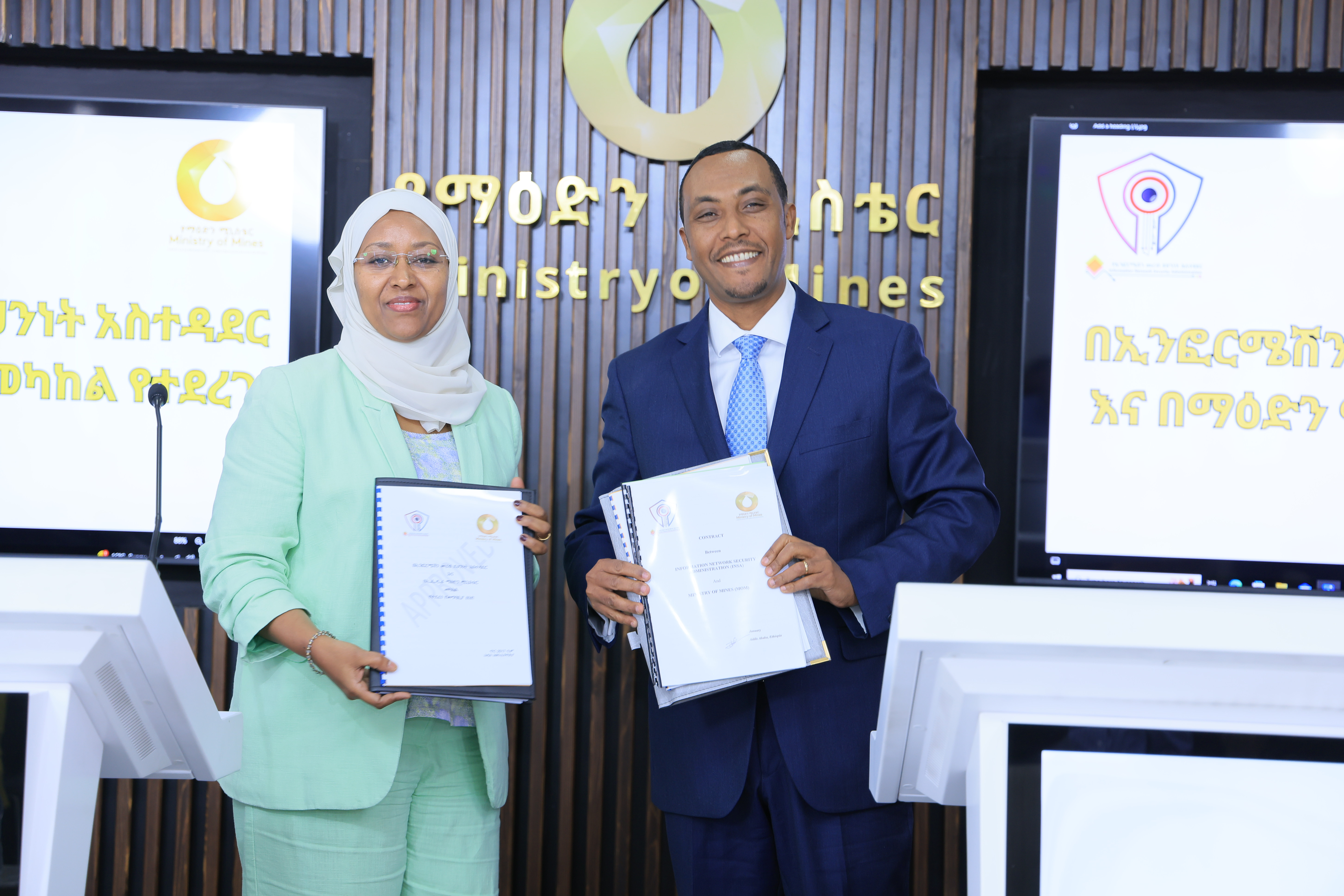 ስምምነቱን የማዕድን ሚኒስትር ሃብታሙ ተገኝ(ኢ/ር) እና የኢንፎርሜሽን መረብ ደህንነት አስተዳደር ዋና ዳይሬክተር ወይዘሮ ትዕግስት ሃሚድ ፈርመውታል፡፡