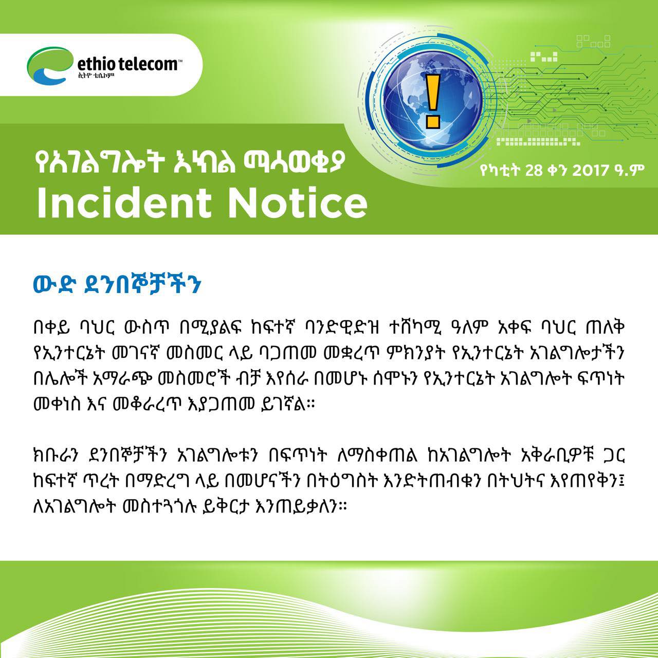 በዚህ የተነሳም ሰሞኑን የኢንተርኔት አገልግሎት ፍጥነት መቀነስ እና መቆራረጥ እያጋጠመ ይገኛል ብሏል ።