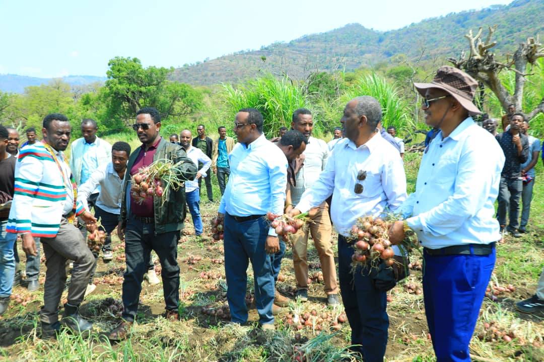 ርዕሰ መስተዳድሩ ከክልሉ ከፍተኛ አመራሮች ጋር በመሆን በካፋ ዞን ጨና ወረዳ በቀነችና ኦፊያ አነስተኛ መስኖ በክላስተር 1 እና 2 በ86 ሄክታር መሬት የለማ የበጋ መስኖ ስንዴና በ192 ሄክታር መሬት የለማ የሽንኩርትና ሌሎች የፍራፍሬ ምርቶችን ተመልክተዋል።