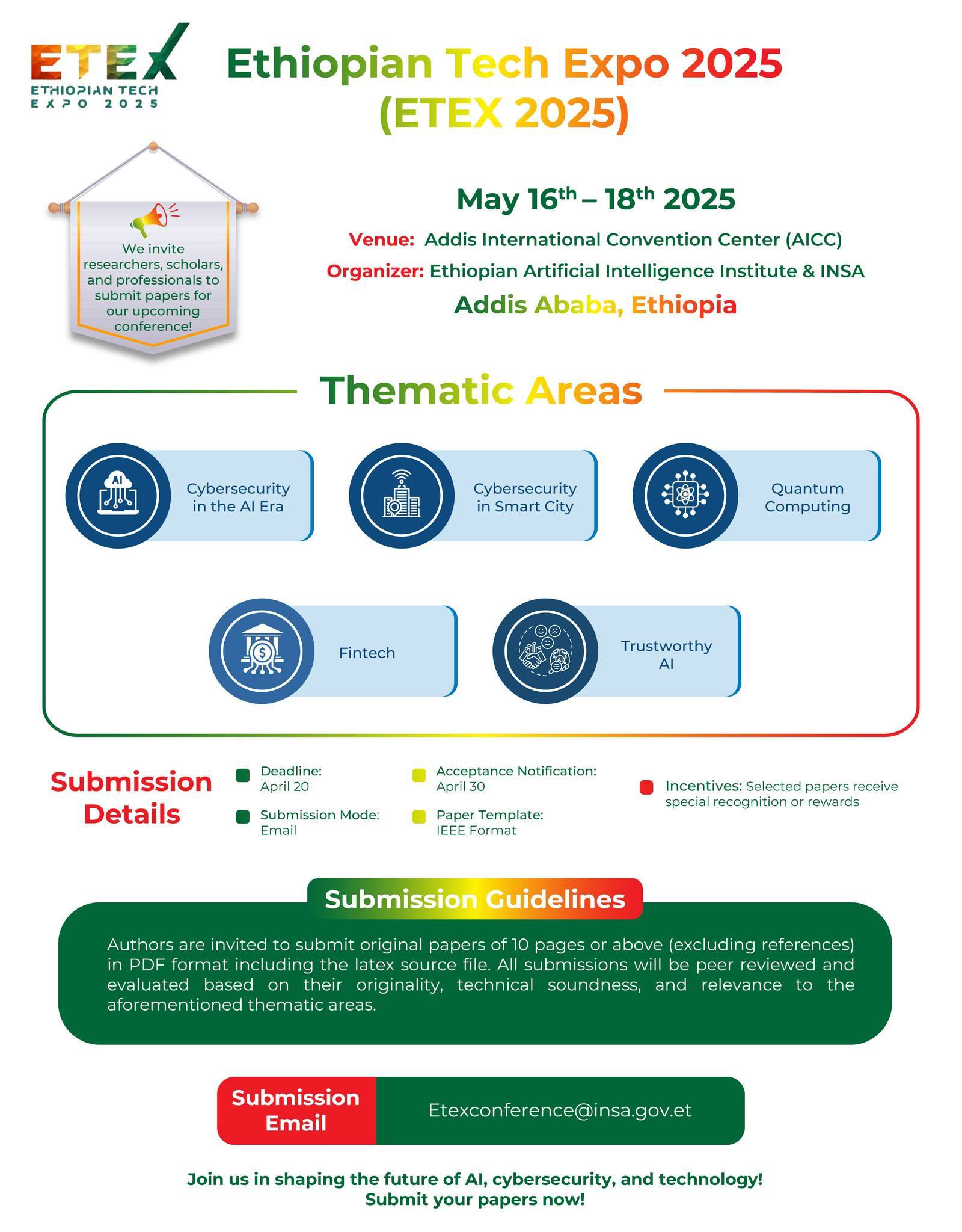 በአርቲፊሻል ኢንተሊጀንስ ዘመን የሳይበር ደህንነት፣ የሳይበር ደህንነት በዘመናዊ ከተሞች፤ በኳንተም ስሌት፣ ፋይንቴክ ዙሪያ ፕሮፖዛላቸውን እንዲያቀርቡ ነው ጥሪ ያቀረበው።