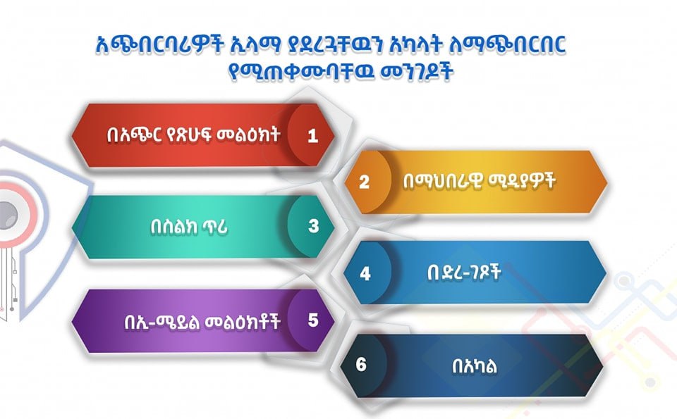 አጭበርባሪዎች ኢላማ ያደረጓቸውን አካላት ለማጭበርበር የሚጠቀሙባቸው የተለያዩ መንገዶች ቢኖሩም በስፋት ከተለመዱት የማጭበርበሪያ መንገዶች መካከል የሚከተሉት ይገኙበታል፦